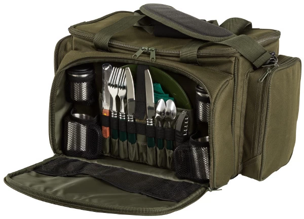The Cooler Food Bag is perfect for the anglers who like to keep their food and drinks nicely organised. The bag features an insulated main compartment that keeps your food fresh. The cutlery and plates can be found in the front pocket. The two large side pockets are perfect for accessory bags. The JRC Defender accessory bags are a perfect fit for these pockets. Including: 2 aluminium mugs, 2 coffee and sugar containers, 2 plastic plates, 2 tea towels, 1 serrated steak/fruit knife, 2 forks, 2 knives, 2 teaspoons, 1 multitool, 1 bottle opener and 1 corkscrew/pen knife.