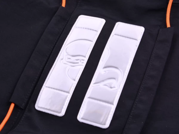 The jacket has an extra-high, fleece-lined collar and a fold-down hood. In addition, there is a flap to protect your face in cold temperatures. The hood and jacket are equipped with large reflectors. The exterior of the jacket has four fleece-lined pockets with airtight zippers.