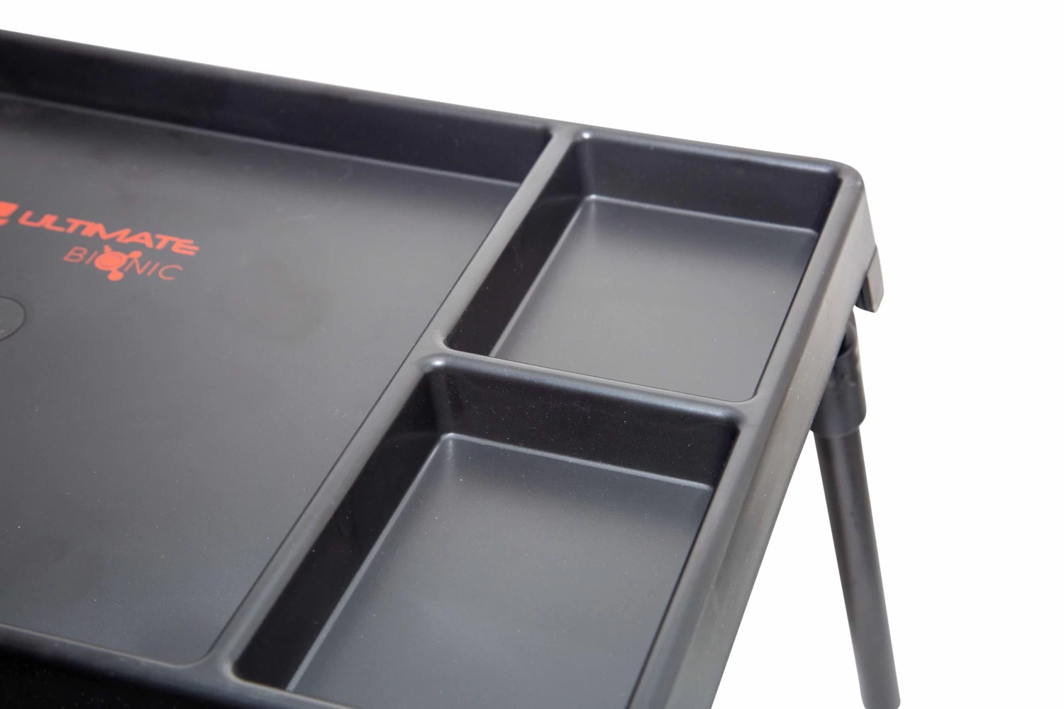 A bivvy table is an indispensable tool for every carp angler. Easily and conveniently place your small equipment while making rigs, or just to make a cup of coffee. Thanks to the anti-slip coating and the compartments with raised edge, everything stays neatly on the table and cannot fall off. The Ultimate Bionic Bivvy Table is made of high-quality plastic and features legs that fold down to a very compact size.